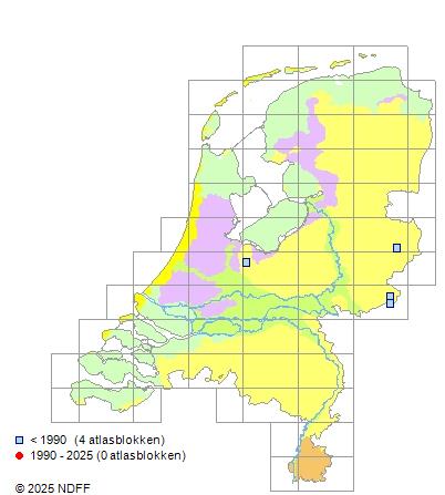 Het aantal atlasblokken (5x5 km) waarin de soort is gemeld binnen een periode van vijf jaar (vanaf 1980) of twintig jaar. Niet gecorrigeerd voor waarnemersinspanning en het aantal doorgegeven waarnemingen kan sterk variëren per periode, dus een trend in verspreiding kan hier niet direct uit worden afgelezen. Het opgegeven jaartal is het eerste jaar van de periode. Bron: gevalideerde waarnemingen uit de NDFF.