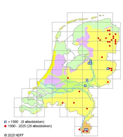 Zeer zeld., in F, Z en S (Hattem; Wapenveld; Hengelo (Ov.); Nijmegen, Oosterhout; Wijlre, kasteel Wijlre). Laatste waarneming dateert van 1979 (Wijlre). Kaart in Nauta & Vellinga, Atlas. 1995.
