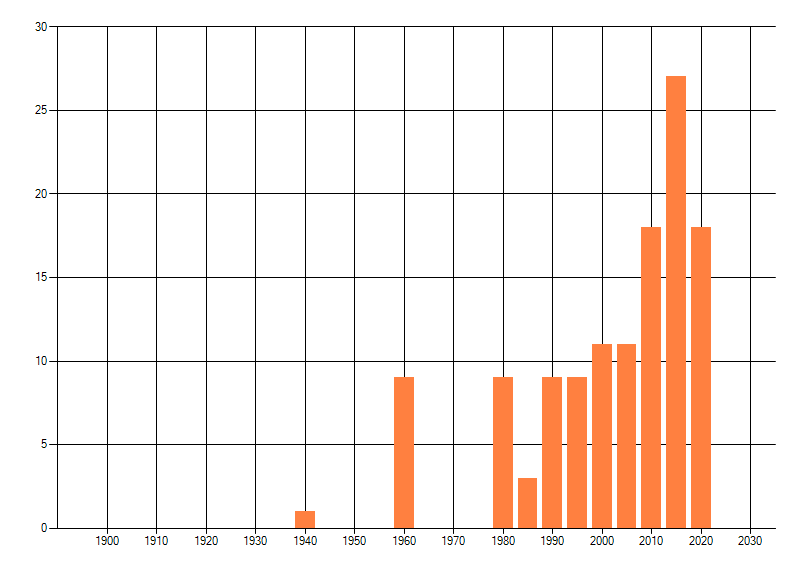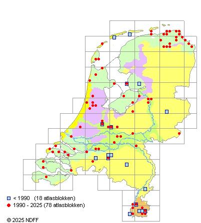 Het aantal atlasblokken (5x5 km) waarin de soort is gemeld binnen een periode van vijf jaar (vanaf 1980) of twintig jaar. Niet gecorrigeerd voor waarnemersinspanning en het aantal doorgegeven waarnemingen kan sterk variëren per periode, dus een trend in verspreiding kan hier niet direct uit worden afgelezen. Het opgegeven jaartal is het eerste jaar van de periode. Bron: gevalideerde waarnemingen uit de NDFF.