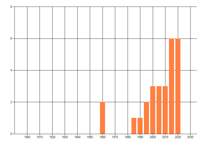 Het aantal atlasblokken (5x5 km) waarin de soort is gemeld binnen een periode van vijf jaar (vanaf 1980) of twintig jaar. Niet gecorrigeerd voor waarnemersinspanning en het aantal doorgegeven waarnemingen kan sterk variëren per periode, dus een trend in verspreiding kan hier niet direct uit worden afgelezen. Het opgegeven jaartal is het eerste jaar van de periode. Bron: gevalideerde waarnemingen uit de NDFF.