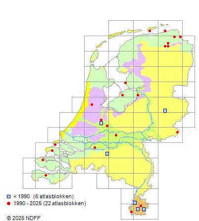 Het aantal atlasblokken (5x5 km) waarin de soort is gemeld binnen een periode van vijf jaar (vanaf 1980) of twintig jaar. Niet gecorrigeerd voor waarnemersinspanning en het aantal doorgegeven waarnemingen kan sterk variëren per periode, dus een trend in verspreiding kan hier niet direct uit worden afgelezen. Het opgegeven jaartal is het eerste jaar van de periode. Bron: gevalideerde waarnemingen uit de NDFF.