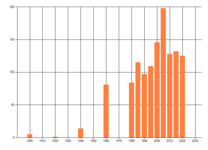 Het aantal atlasblokken (5x5 km) waarin de soort is gemeld binnen een periode van vijf jaar (vanaf 1980) of twintig jaar. Niet gecorrigeerd voor waarnemersinspanning en het aantal doorgegeven waarnemingen kan sterk variëren per periode, dus een trend in verspreiding kan hier niet direct uit worden afgelezen. Het opgegeven jaartal is het eerste jaar van de periode. Bron: gevalideerde waarnemingen uit de NDFF.