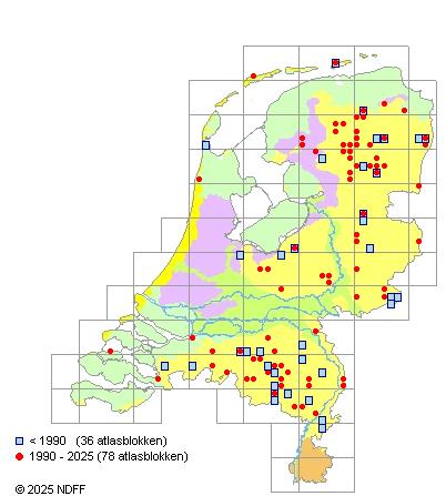 Het aantal atlasblokken (5x5 km) waarin de soort is gemeld binnen een periode van vijf jaar (vanaf 1980) of twintig jaar. Niet gecorrigeerd voor waarnemersinspanning en het aantal doorgegeven waarnemingen kan sterk variëren per periode, dus een trend in verspreiding kan hier niet direct uit worden afgelezen. Het opgegeven jaartal is het eerste jaar van de periode. Bron: gevalideerde waarnemingen uit de NDFF.
