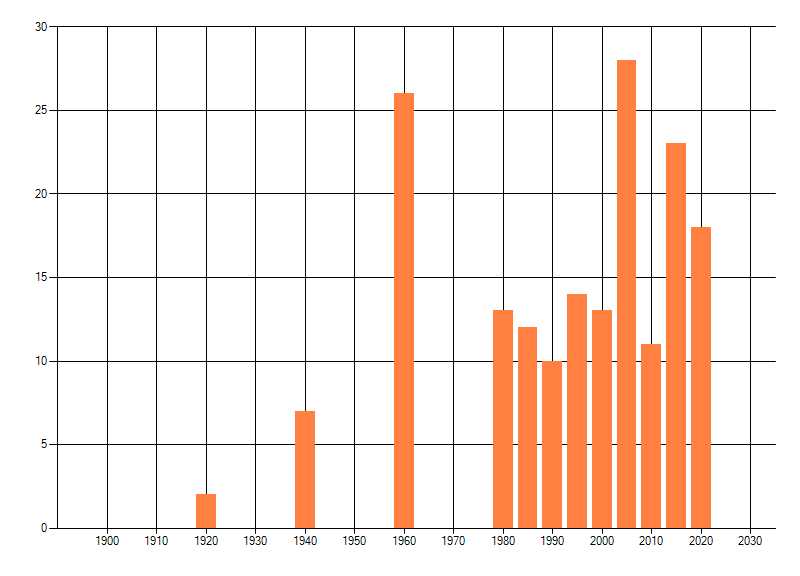 Het aantal atlasblokken (5x5 km) waarin de soort is gemeld binnen een periode van vijf jaar (vanaf 1980) of twintig jaar. Niet gecorrigeerd voor waarnemersinspanning en het aantal doorgegeven waarnemingen kan sterk variëren per periode, dus een trend in verspreiding kan hier niet direct uit worden afgelezen. Het opgegeven jaartal is het eerste jaar van de periode. Bron: gevalideerde waarnemingen uit de NDFF.