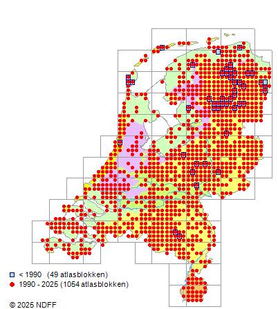Het aantal atlasblokken (5x5 km) waarin de soort is gemeld binnen een periode van vijf jaar (vanaf 1980) of twintig jaar. Niet gecorrigeerd voor waarnemersinspanning en het aantal doorgegeven waarnemingen kan sterk variëren per periode, dus een trend in verspreiding kan hier niet direct uit worden afgelezen. Het opgegeven jaartal is het eerste jaar van de periode. Bron: gevalideerde waarnemingen uit de NDFF.