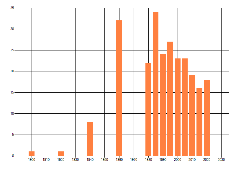 Het aantal atlasblokken (5x5 km) waarin de soort is gemeld binnen een periode van vijf jaar (vanaf 1980) of twintig jaar. Niet gecorrigeerd voor waarnemersinspanning en het aantal doorgegeven waarnemingen kan sterk variëren per periode, dus een trend in verspreiding kan hier niet direct uit worden afgelezen. Het opgegeven jaartal is het eerste jaar van de periode. Bron: gevalideerde waarnemingen uit de NDFF.
