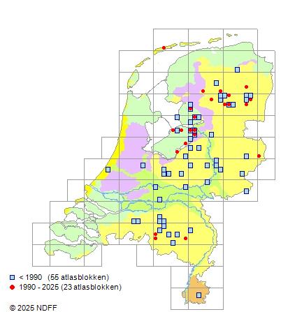 Het aantal atlasblokken (5x5 km) waarin de soort is gemeld binnen een periode van vijf jaar (vanaf 1980) of twintig jaar. Niet gecorrigeerd voor waarnemersinspanning en het aantal doorgegeven waarnemingen kan sterk variëren per periode, dus een trend in verspreiding kan hier niet direct uit worden afgelezen. Het opgegeven jaartal is het eerste jaar van de periode. Bron: gevalideerde waarnemingen uit de NDFF.