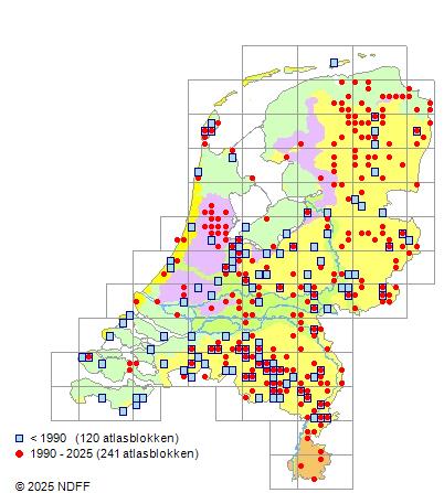 Het aantal atlasblokken (5x5 km) waarin de soort is gemeld binnen een periode van vijf jaar (vanaf 1980) of twintig jaar. Niet gecorrigeerd voor waarnemersinspanning en het aantal doorgegeven waarnemingen kan sterk variëren per periode, dus een trend in verspreiding kan hier niet direct uit worden afgelezen. Het opgegeven jaartal is het eerste jaar van de periode. Bron: gevalideerde waarnemingen uit de NDFF.