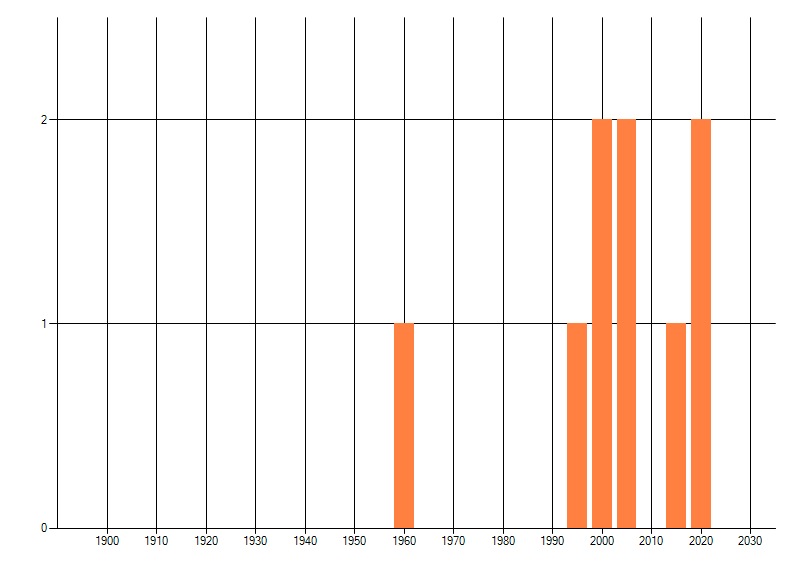Het aantal atlasblokken (5x5 km) waarin de soort is gemeld binnen een periode van vijf jaar (vanaf 1980) of twintig jaar. Niet gecorrigeerd voor waarnemersinspanning en het aantal doorgegeven waarnemingen kan sterk variëren per periode, dus een trend in verspreiding kan hier niet direct uit worden afgelezen. Het opgegeven jaartal is het eerste jaar van de periode. Bron: gevalideerde waarnemingen uit de NDFF.