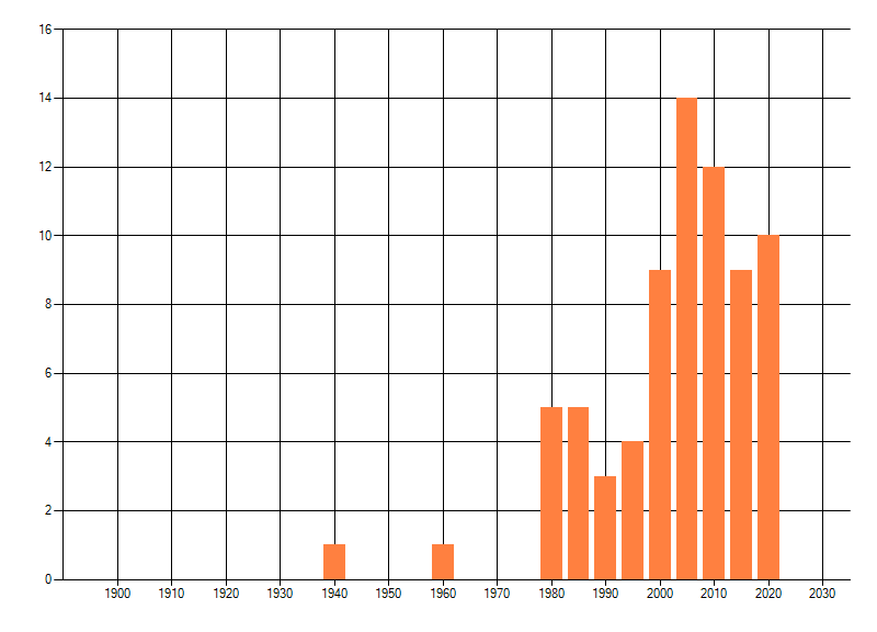 Het aantal atlasblokken (5x5 km) waarin de soort is gemeld binnen een periode van vijf jaar (vanaf 1980) of twintig jaar. Niet gecorrigeerd voor waarnemersinspanning en het aantal doorgegeven waarnemingen kan sterk variëren per periode, dus een trend in verspreiding kan hier niet direct uit worden afgelezen. Het opgegeven jaartal is het eerste jaar van de periode. Bron: gevalideerde waarnemingen uit de NDFF.