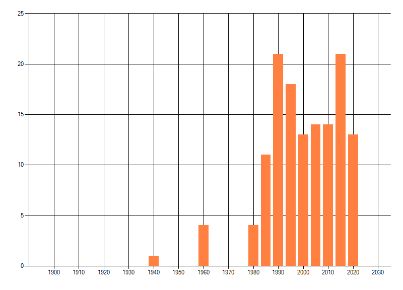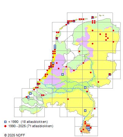 Het aantal atlasblokken (5x5 km) waarin de soort is gemeld binnen een periode van vijf jaar (vanaf 1980) of twintig jaar. Niet gecorrigeerd voor waarnemersinspanning en het aantal doorgegeven waarnemingen kan sterk variëren per periode, dus een trend in verspreiding kan hier niet direct uit worden afgelezen. Het opgegeven jaartal is het eerste jaar van de periode. Bron: gevalideerde waarnemingen uit de NDFF.