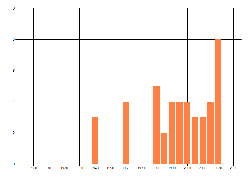 Het aantal atlasblokken (5x5 km) waarin de soort is gemeld binnen een periode van vijf jaar (vanaf 1980) of twintig jaar. Niet gecorrigeerd voor waarnemersinspanning en het aantal doorgegeven waarnemingen kan sterk variëren per periode, dus een trend in verspreiding kan hier niet direct uit worden afgelezen. Het opgegeven jaartal is het eerste jaar van de periode. Bron: gevalideerde waarnemingen uit de NDFF.
