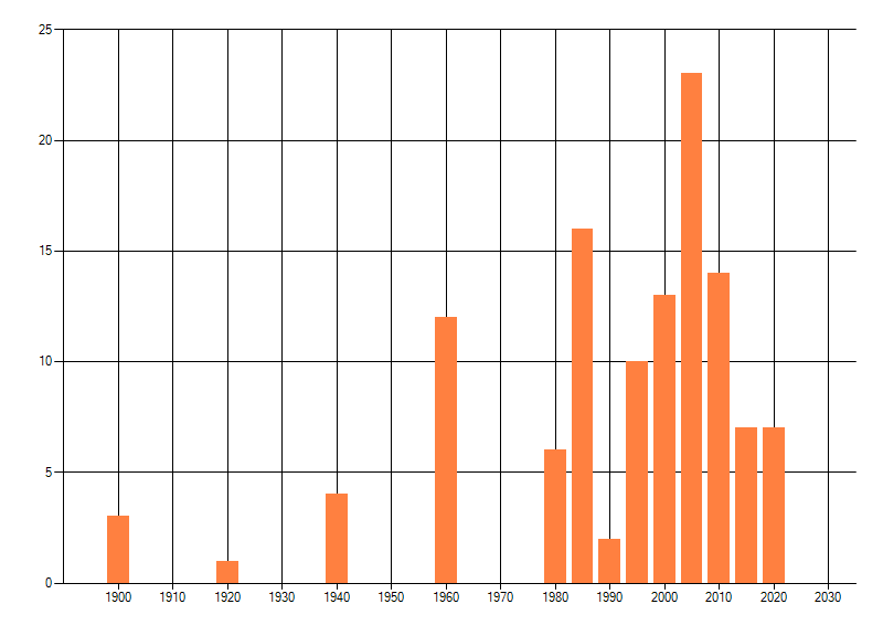 Het aantal atlasblokken (5x5 km) waarin de soort is gemeld binnen een periode van vijf jaar (vanaf 1980) of twintig jaar. Niet gecorrigeerd voor waarnemersinspanning en het aantal doorgegeven waarnemingen kan sterk variëren per periode, dus een trend in verspreiding kan hier niet direct uit worden afgelezen. Het opgegeven jaartal is het eerste jaar van de periode. Bron: gevalideerde waarnemingen uit de NDFF.