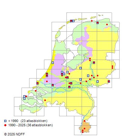 Het aantal atlasblokken (5x5 km) waarin de soort is gemeld binnen een periode van vijf jaar (vanaf 1980) of twintig jaar. Niet gecorrigeerd voor waarnemersinspanning en het aantal doorgegeven waarnemingen kan sterk variëren per periode, dus een trend in verspreiding kan hier niet direct uit worden afgelezen. Het opgegeven jaartal is het eerste jaar van de periode. Bron: gevalideerde waarnemingen uit de NDFF.
