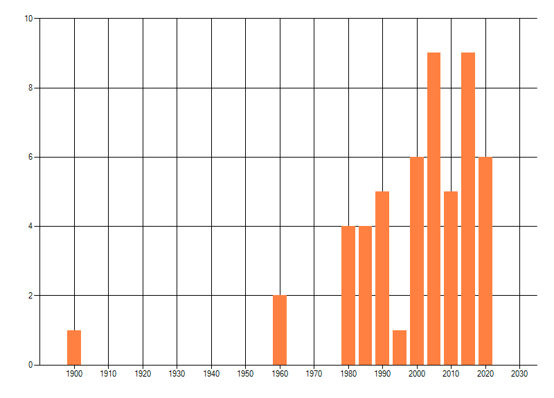 Het aantal atlasblokken (5x5 km) waarin de soort is gemeld binnen een periode van vijf jaar (vanaf 1980) of twintig jaar. Niet gecorrigeerd voor waarnemersinspanning en het aantal doorgegeven waarnemingen kan sterk variëren per periode, dus een trend in verspreiding kan hier niet direct uit worden afgelezen. Het opgegeven jaartal is het eerste jaar van de periode. Bron: gevalideerde waarnemingen uit de NDFF.