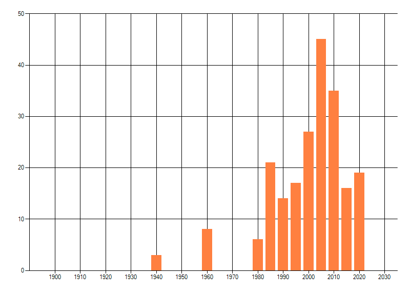 Het aantal atlasblokken (5x5 km) waarin de soort is gemeld binnen een periode van vijf jaar (vanaf 1980) of twintig jaar. Niet gecorrigeerd voor waarnemersinspanning en het aantal doorgegeven waarnemingen kan sterk variëren per periode, dus een trend in verspreiding kan hier niet direct uit worden afgelezen. Het opgegeven jaartal is het eerste jaar van de periode. Bron: gevalideerde waarnemingen uit de NDFF.