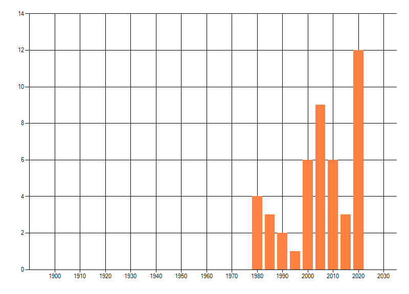 Het aantal atlasblokken (5x5 km) waarin de soort is gemeld binnen een periode van vijf jaar (vanaf 1980) of twintig jaar. Niet gecorrigeerd voor waarnemersinspanning en het aantal doorgegeven waarnemingen kan sterk variëren per periode, dus een trend in verspreiding kan hier niet direct uit worden afgelezen. Het opgegeven jaartal is het eerste jaar van de periode. Bron: gevalideerde waarnemingen uit de NDFF.