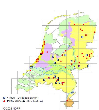 Het aantal atlasblokken (5x5 km) waarin de soort is gemeld binnen een periode van vijf jaar (vanaf 1980) of twintig jaar. Niet gecorrigeerd voor waarnemersinspanning en het aantal doorgegeven waarnemingen kan sterk variëren per periode, dus een trend in verspreiding kan hier niet direct uit worden afgelezen. Het opgegeven jaartal is het eerste jaar van de periode. Bron: gevalideerde waarnemingen uit de NDFF.