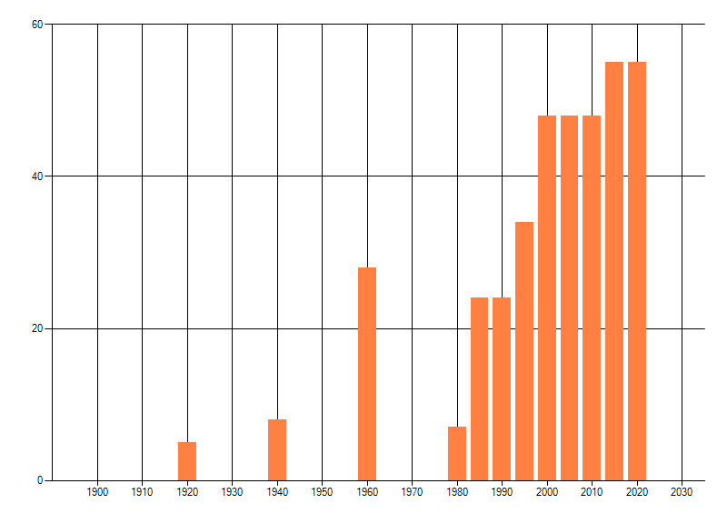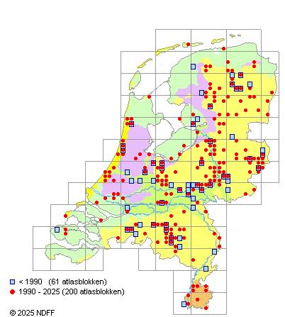 Het aantal atlasblokken (5x5 km) waarin de soort is gemeld binnen een periode van vijf jaar (vanaf 1980) of twintig jaar. Niet gecorrigeerd voor waarnemersinspanning en het aantal doorgegeven waarnemingen kan sterk variëren per periode, dus een trend in verspreiding kan hier niet direct uit worden afgelezen. Het opgegeven jaartal is het eerste jaar van de periode. Bron: gevalideerde waarnemingen uit de NDFF.