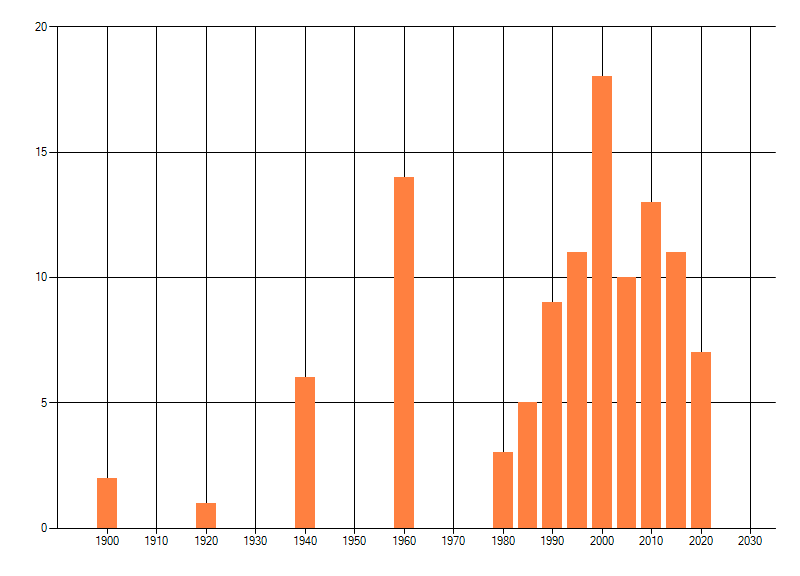 Het aantal atlasblokken (5x5 km) waarin de soort is gemeld binnen een periode van vijf jaar (vanaf 1980) of twintig jaar. Niet gecorrigeerd voor waarnemersinspanning en het aantal doorgegeven waarnemingen kan sterk variëren per periode, dus een trend in verspreiding kan hier niet direct uit worden afgelezen. Het opgegeven jaartal is het eerste jaar van de periode. Bron: gevalideerde waarnemingen uit de NDFF.