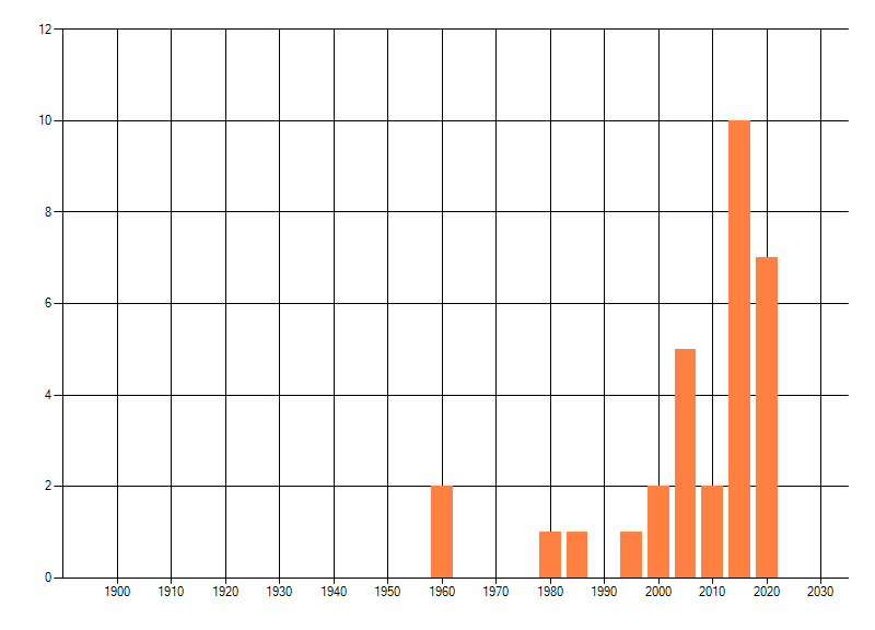 Het aantal atlasblokken (5x5 km) waarin de soort is gemeld binnen een periode van vijf jaar (vanaf 1980) of twintig jaar. Niet gecorrigeerd voor waarnemersinspanning en het aantal doorgegeven waarnemingen kan sterk variëren per periode, dus een trend in verspreiding kan hier niet direct uit worden afgelezen. Het opgegeven jaartal is het eerste jaar van de periode. Bron: gevalideerde waarnemingen uit de NDFF.