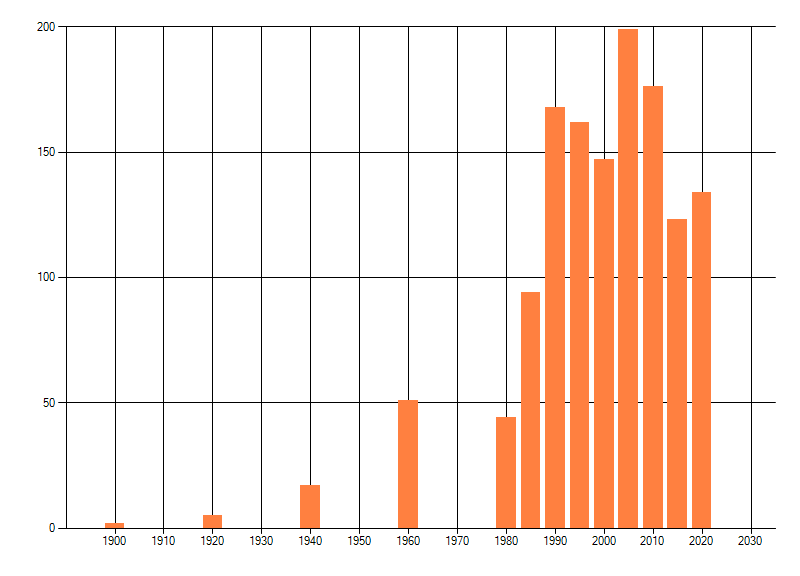 Het aantal atlasblokken (5x5 km) waarin de soort is gemeld binnen een periode van vijf jaar (vanaf 1980) of twintig jaar. Niet gecorrigeerd voor waarnemersinspanning en het aantal doorgegeven waarnemingen kan sterk variëren per periode, dus een trend in verspreiding kan hier niet direct uit worden afgelezen. Het opgegeven jaartal is het eerste jaar van de periode. Bron: gevalideerde waarnemingen uit de NDFF.