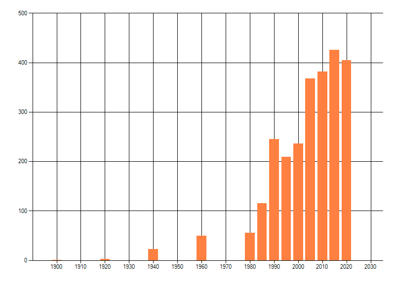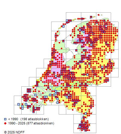 Het aantal atlasblokken (5x5 km) waarin de soort is gemeld binnen een periode van vijf jaar (vanaf 1980) of twintig jaar. Niet gecorrigeerd voor waarnemersinspanning en het aantal doorgegeven waarnemingen kan sterk variëren per periode, dus een trend in verspreiding kan hier niet direct uit worden afgelezen. Het opgegeven jaartal is het eerste jaar van de periode. Bron: gevalideerde waarnemingen uit de NDFF.