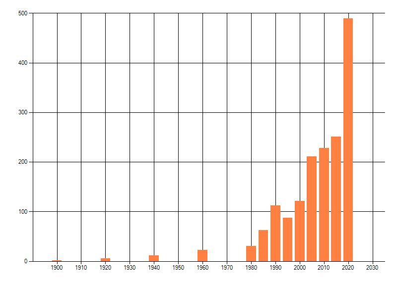 Het aantal atlasblokken (5x5 km) waarin de soort is gemeld binnen een periode van vijf jaar (vanaf 1980) of twintig jaar. Niet gecorrigeerd voor waarnemersinspanning en het aantal doorgegeven waarnemingen kan sterk variëren per periode, dus een trend in verspreiding kan hier niet direct uit worden afgelezen. Het opgegeven jaartal is het eerste jaar van de periode. Bron: gevalideerde waarnemingen uit de NDFF.