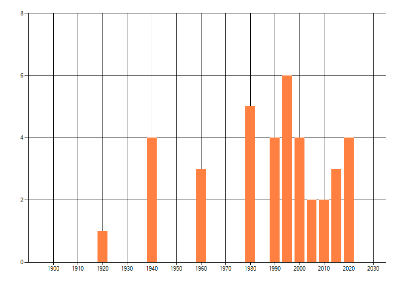 Het aantal atlasblokken (5x5 km) waarin de soort is gemeld binnen een periode van vijf jaar (vanaf 1980) of twintig jaar. Niet gecorrigeerd voor waarnemersinspanning en het aantal doorgegeven waarnemingen kan sterk variëren per periode, dus een trend in verspreiding kan hier niet direct uit worden afgelezen. Het opgegeven jaartal is het eerste jaar van de periode. Bron: gevalideerde waarnemingen uit de NDFF.