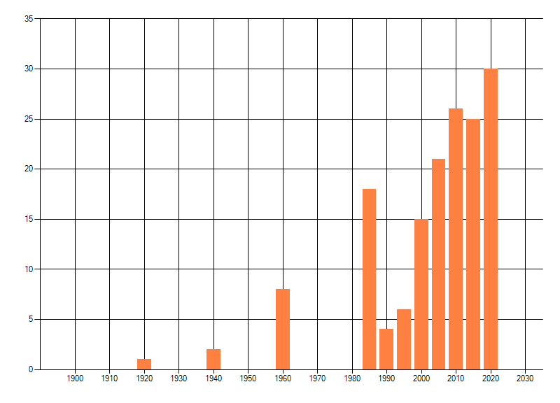 Het aantal atlasblokken (5x5 km) waarin de soort is gemeld binnen een periode van vijf jaar (vanaf 1980) of twintig jaar. Niet gecorrigeerd voor waarnemersinspanning en het aantal doorgegeven waarnemingen kan sterk variëren per periode, dus een trend in verspreiding kan hier niet direct uit worden afgelezen. Het opgegeven jaartal is het eerste jaar van de periode. Bron: gevalideerde waarnemingen uit de NDFF.