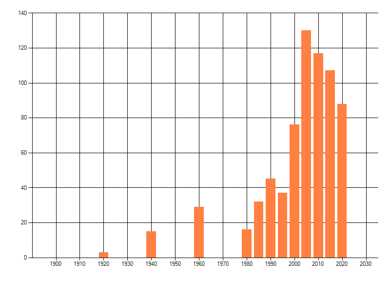 Het aantal atlasblokken (5x5 km) waarin de soort is gemeld binnen een periode van vijf jaar (vanaf 1980) of twintig jaar. Niet gecorrigeerd voor waarnemersinspanning en het aantal doorgegeven waarnemingen kan sterk variëren per periode, dus een trend in verspreiding kan hier niet direct uit worden afgelezen. Het opgegeven jaartal is het eerste jaar van de periode. Bron: gevalideerde waarnemingen uit de NDFF.