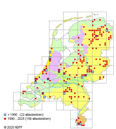 Het aantal atlasblokken (5x5 km) waarin de soort is gemeld binnen een periode van vijf jaar (vanaf 1980) of twintig jaar. Niet gecorrigeerd voor waarnemersinspanning en het aantal doorgegeven waarnemingen kan sterk variëren per periode, dus een trend in verspreiding kan hier niet direct uit worden afgelezen. Het opgegeven jaartal is het eerste jaar van de periode. Bron: gevalideerde waarnemingen uit de NDFF.