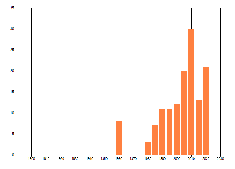 Het aantal atlasblokken (5x5 km) waarin de soort is gemeld binnen een periode van vijf jaar (vanaf 1980) of twintig jaar. Niet gecorrigeerd voor waarnemersinspanning en het aantal doorgegeven waarnemingen kan sterk variëren per periode, dus een trend in verspreiding kan hier niet direct uit worden afgelezen. Het opgegeven jaartal is het eerste jaar van de periode. Bron: gevalideerde waarnemingen uit de NDFF.
