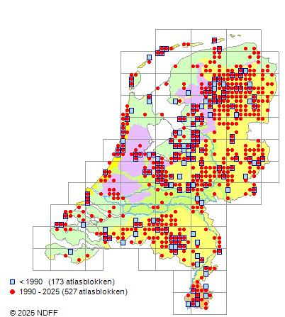 Het aantal atlasblokken (5x5 km) waarin de soort is gemeld binnen een periode van vijf jaar (vanaf 1980) of twintig jaar. Niet gecorrigeerd voor waarnemersinspanning en het aantal doorgegeven waarnemingen kan sterk variëren per periode, dus een trend in verspreiding kan hier niet direct uit worden afgelezen. Het opgegeven jaartal is het eerste jaar van de periode. Bron: gevalideerde waarnemingen uit de NDFF.
