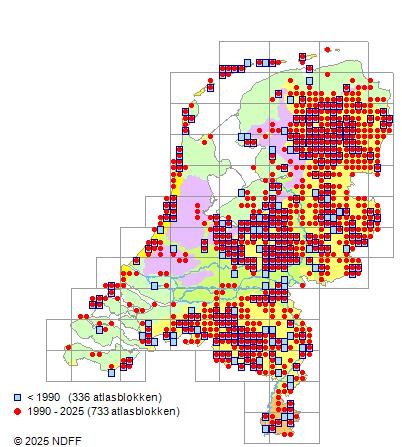 Het aantal atlasblokken (5x5 km) waarin de soort is gemeld binnen een periode van vijf jaar (vanaf 1980) of twintig jaar. Niet gecorrigeerd voor waarnemersinspanning en het aantal doorgegeven waarnemingen kan sterk variëren per periode, dus een trend in verspreiding kan hier niet direct uit worden afgelezen. Het opgegeven jaartal is het eerste jaar van de periode. Bron: gevalideerde waarnemingen uit de NDFF.