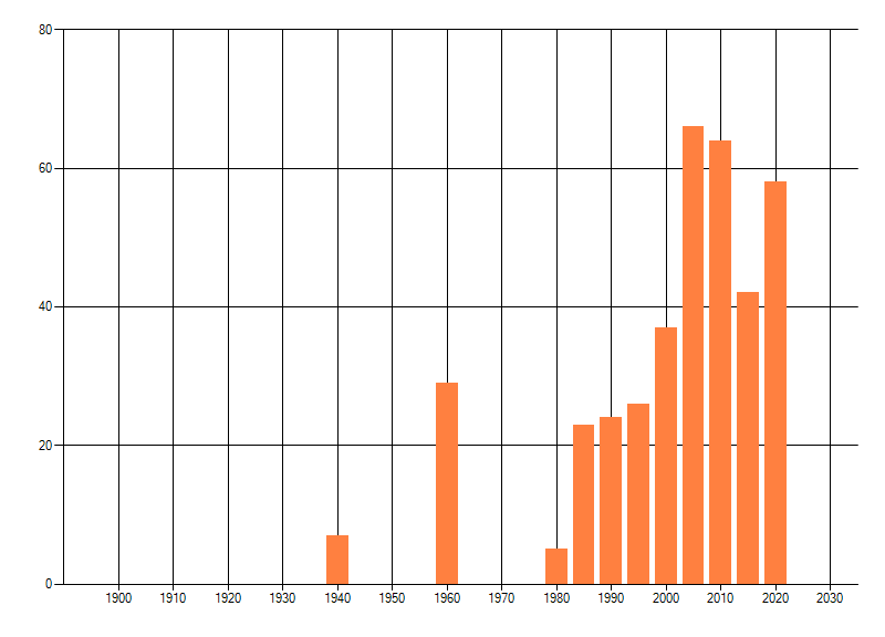 Het aantal atlasblokken (5x5 km) waarin de soort is gemeld binnen een periode van vijf jaar (vanaf 1980) of twintig jaar. Niet gecorrigeerd voor waarnemersinspanning en het aantal doorgegeven waarnemingen kan sterk variëren per periode, dus een trend in verspreiding kan hier niet direct uit worden afgelezen. Het opgegeven jaartal is het eerste jaar van de periode. Bron: gevalideerde waarnemingen uit de NDFF.
