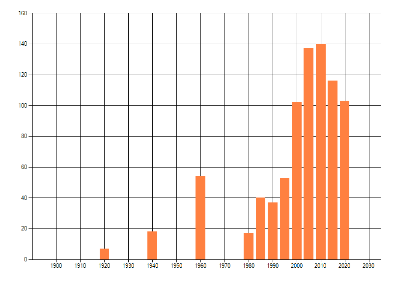 Het aantal atlasblokken (5x5 km) waarin de soort is gemeld binnen een periode van vijf jaar (vanaf 1980) of twintig jaar. Niet gecorrigeerd voor waarnemersinspanning en het aantal doorgegeven waarnemingen kan sterk variëren per periode, dus een trend in verspreiding kan hier niet direct uit worden afgelezen. Het opgegeven jaartal is het eerste jaar van de periode. Bron: gevalideerde waarnemingen uit de NDFF.