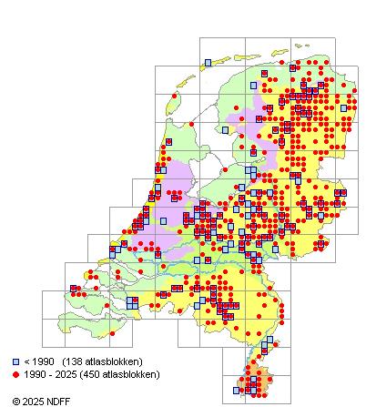Het aantal atlasblokken (5x5 km) waarin de soort is gemeld binnen een periode van vijf jaar (vanaf 1980) of twintig jaar. Niet gecorrigeerd voor waarnemersinspanning en het aantal doorgegeven waarnemingen kan sterk variëren per periode, dus een trend in verspreiding kan hier niet direct uit worden afgelezen. Het opgegeven jaartal is het eerste jaar van de periode. Bron: gevalideerde waarnemingen uit de NDFF.