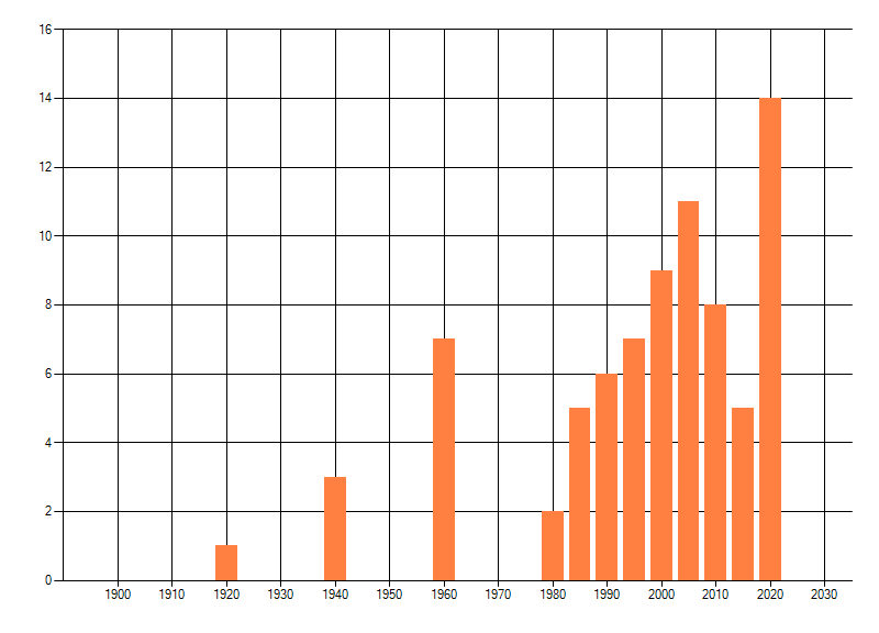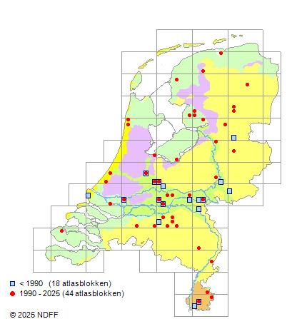 Het aantal atlasblokken (5x5 km) waarin de soort is gemeld binnen een periode van vijf jaar (vanaf 1980) of twintig jaar. Niet gecorrigeerd voor waarnemersinspanning en het aantal doorgegeven waarnemingen kan sterk variëren per periode, dus een trend in verspreiding kan hier niet direct uit worden afgelezen. Het opgegeven jaartal is het eerste jaar van de periode. Bron: gevalideerde waarnemingen uit de NDFF.
