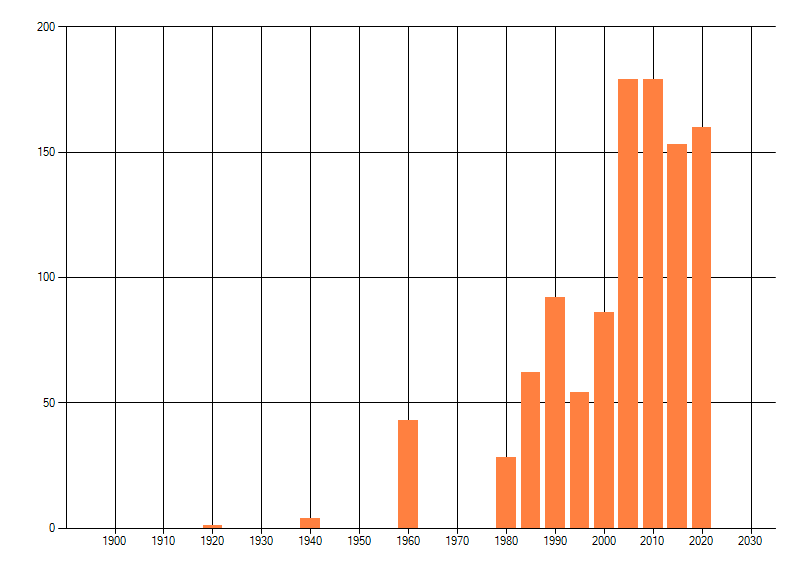 Het aantal atlasblokken (5x5 km) waarin de soort is gemeld binnen een periode van vijf jaar (vanaf 1980) of twintig jaar. Niet gecorrigeerd voor waarnemersinspanning en het aantal doorgegeven waarnemingen kan sterk variëren per periode, dus een trend in verspreiding kan hier niet direct uit worden afgelezen. Het opgegeven jaartal is het eerste jaar van de periode. Bron: gevalideerde waarnemingen uit de NDFF.