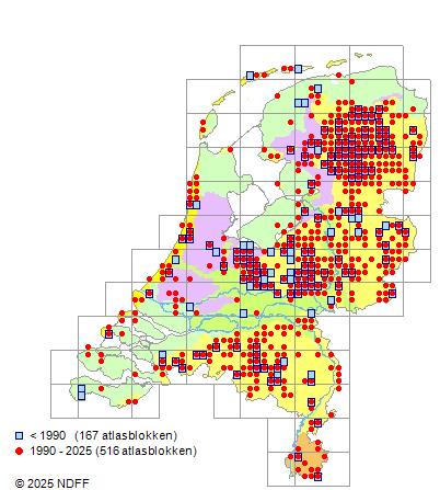 Het aantal atlasblokken (5x5 km) waarin de soort is gemeld binnen een periode van vijf jaar (vanaf 1980) of twintig jaar. Niet gecorrigeerd voor waarnemersinspanning en het aantal doorgegeven waarnemingen kan sterk variëren per periode, dus een trend in verspreiding kan hier niet direct uit worden afgelezen. Het opgegeven jaartal is het eerste jaar van de periode. Bron: gevalideerde waarnemingen uit de NDFF.