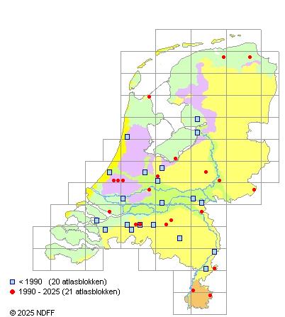 Het aantal atlasblokken (5x5 km) waarin de soort is gemeld binnen een periode van vijf jaar (vanaf 1980) of twintig jaar. Niet gecorrigeerd voor waarnemersinspanning en het aantal doorgegeven waarnemingen kan sterk variëren per periode, dus een trend in verspreiding kan hier niet direct uit worden afgelezen. Het opgegeven jaartal is het eerste jaar van de periode. Bron: gevalideerde waarnemingen uit de NDFF.