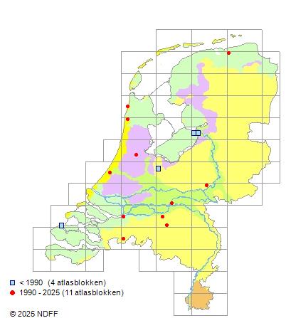 Het aantal atlasblokken (5x5 km) waarin de soort is gemeld binnen een periode van vijf jaar (vanaf 1980) of twintig jaar. Niet gecorrigeerd voor waarnemersinspanning en het aantal doorgegeven waarnemingen kan sterk variëren per periode, dus een trend in verspreiding kan hier niet direct uit worden afgelezen. Het opgegeven jaartal is het eerste jaar van de periode. Bron: gevalideerde waarnemingen uit de NDFF.