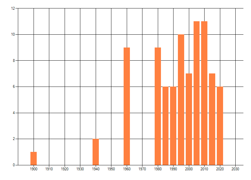 Het aantal atlasblokken (5x5 km) waarin de soort is gemeld binnen een periode van vijf jaar (vanaf 1980) of twintig jaar. Niet gecorrigeerd voor waarnemersinspanning en het aantal doorgegeven waarnemingen kan sterk variëren per periode, dus een trend in verspreiding kan hier niet direct uit worden afgelezen. Het opgegeven jaartal is het eerste jaar van de periode. Bron: gevalideerde waarnemingen uit de NDFF.