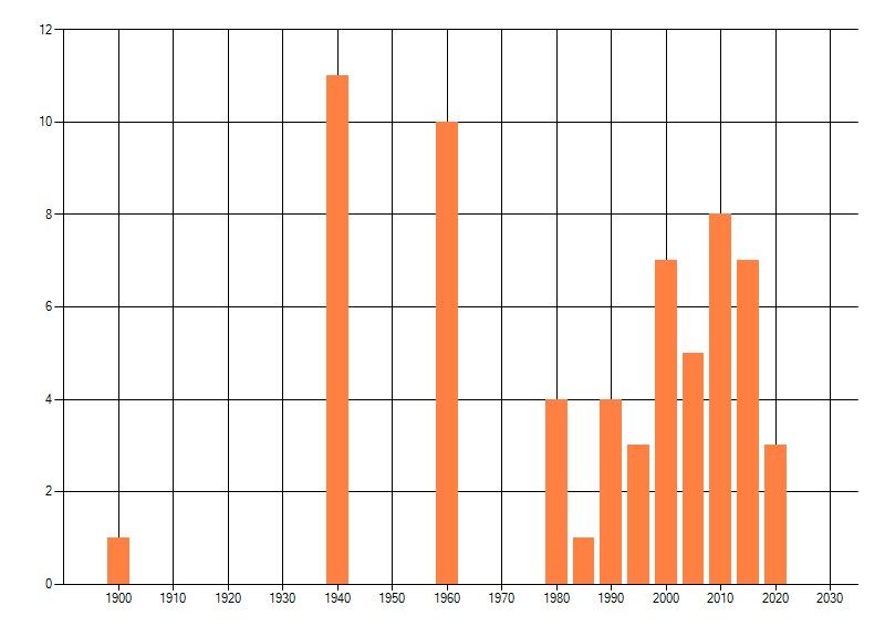 Het aantal atlasblokken (5x5 km) waarin de soort is gemeld binnen een periode van vijf jaar (vanaf 1980) of twintig jaar. Niet gecorrigeerd voor waarnemersinspanning en het aantal doorgegeven waarnemingen kan sterk variëren per periode, dus een trend in verspreiding kan hier niet direct uit worden afgelezen. Het opgegeven jaartal is het eerste jaar van de periode. Bron: gevalideerde waarnemingen uit de NDFF.