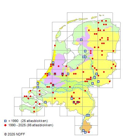 Het aantal atlasblokken (5x5 km) waarin de soort is gemeld binnen een periode van vijf jaar (vanaf 1980) of twintig jaar. Niet gecorrigeerd voor waarnemersinspanning en het aantal doorgegeven waarnemingen kan sterk variëren per periode, dus een trend in verspreiding kan hier niet direct uit worden afgelezen. Het opgegeven jaartal is het eerste jaar van de periode. Bron: gevalideerde waarnemingen uit de NDFF.