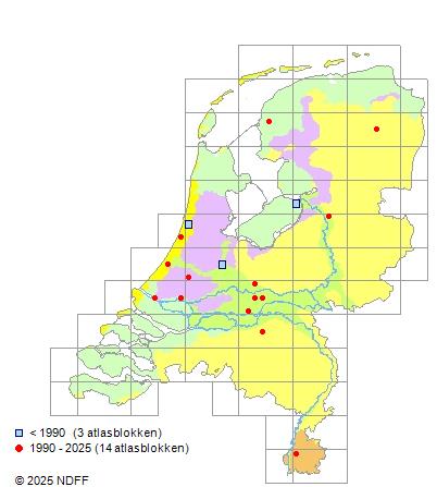 Het aantal atlasblokken (5x5 km) waarin de soort is gemeld binnen een periode van vijf jaar (vanaf 1980) of twintig jaar. Niet gecorrigeerd voor waarnemersinspanning en het aantal doorgegeven waarnemingen kan sterk variëren per periode, dus een trend in verspreiding kan hier niet direct uit worden afgelezen. Het opgegeven jaartal is het eerste jaar van de periode. Bron: gevalideerde waarnemingen uit de NDFF.