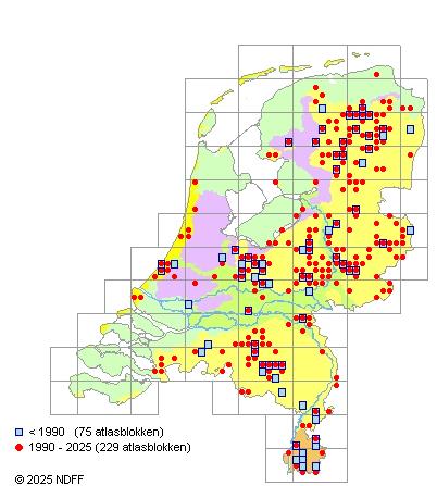 Het aantal atlasblokken (5x5 km) waarin de soort is gemeld binnen een periode van vijf jaar (vanaf 1980) of twintig jaar. Niet gecorrigeerd voor waarnemersinspanning en het aantal doorgegeven waarnemingen kan sterk variëren per periode, dus een trend in verspreiding kan hier niet direct uit worden afgelezen. Het opgegeven jaartal is het eerste jaar van de periode. Bron: gevalideerde waarnemingen uit de NDFF.