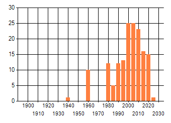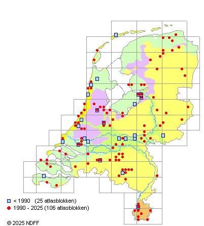 Het aantal atlasblokken (5x5 km) waarin de soort is gemeld binnen een periode van vijf jaar (vanaf 1980) of twintig jaar. Niet gecorrigeerd voor waarnemersinspanning en het aantal doorgegeven waarnemingen kan sterk variëren per periode, dus een trend in verspreiding kan hier niet direct uit worden afgelezen. Het opgegeven jaartal is het eerste jaar van de periode. Bron: gevalideerde waarnemingen uit de NDFF.