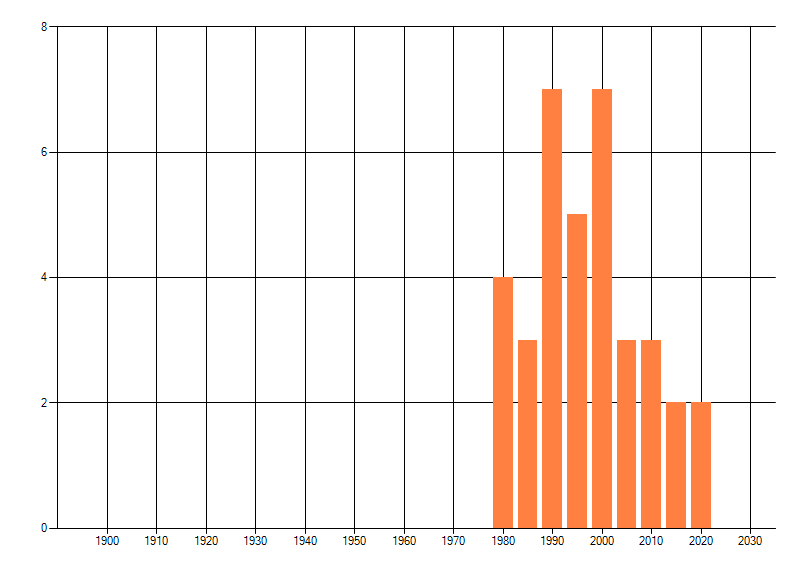 Het aantal atlasblokken (5x5 km) waarin de soort is gemeld binnen een periode van vijf jaar (vanaf 1980) of twintig jaar. Niet gecorrigeerd voor waarnemersinspanning en het aantal doorgegeven waarnemingen kan sterk variëren per periode, dus een trend in verspreiding kan hier niet direct uit worden afgelezen. Het opgegeven jaartal is het eerste jaar van de periode. Bron: gevalideerde waarnemingen uit de NDFF.
